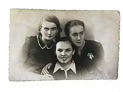 By late 1941 Vilna was also occupied by the Germans, who immediately started murdering the Jewish inhabitants. Hazan worked as a nurse for while in a hospital in the ghetto.[2] Because of her Aryan appearance, Hazan then volunteered to act as a courier (kasharit) for the resistance, carrying messages, money and arms to resistance groups, between the ghettos of Vilna, Grodno, Lida and Bialystok. She adopted the name of a Polish woman that she knew, obtaining her passport, changing the photograph to become Bronislawa Limanowska, an identity she maintained throughout the war. She began wearing a crucifix and attending church regularly. She moved to Grodno, where her room became a meeting place for other couriers of the "Kashariyot". She obtained a job with the Gestapo as an interpreter, allowing her to steal documents and stationery that she passed on to the resistance.[1] She was invited by one of the Gestapo officers to their Christmas party in 1941. On explaining that she had two friends staying with her, she was urged to bring them too. While at the party, one of the Gestapo officers took a picture of the three of them, Hazan, Tema Sznajderman and Lonka Korzybrodska, all three of them young Jewish women part of the Kashariyot, living with assumed Polish identities.[3]