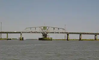 The Ben Sawyer Bridge is a swing bridge that connects the town of Mount Pleasant with Sullivan's Island in South Carolina. The bridge swings on its central axis to open for boat traffic which is too tall to clear the bridge, and has an operator's house in the center of the swing span from which a tender can operate the bridge. The bridge was originally constructed in 1945,[1][2] but the steel superstructure for the approach spans and swing span was replaced in 2010, albeit retaining the same general appearance.