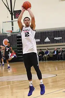 As a teenager, Simmons was torn between his two loves of basketball and Australian rules football,[14] but he eventually decided to focus on basketball.[15][16][17] In year 9, at the age of 15, Simmons played basketball for Box Hill Senior Secondary College at the 2011 Australian Schools Championships[10] before taking up a scholarship at the Australian Institute of Sport in 2012.[18] Later that year, Simmons made his first appearance in the United States at the renowned Pangos All-American Camp for basketball prospects.[19][20][21] Despite being only 15 years old, he was chosen to represent Australia at the 2012 FIBA Under-17 World Championship.[10]
