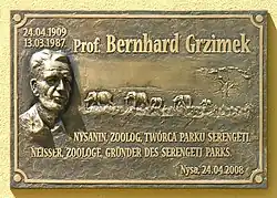 Bernhard Klemens Maria Hoffbauer Pius Grzimek (German pronunciation: [ˈɡʒɪmɛk]; 24 April 1909 – 13 March 1987) was a German zoo director, zoologist, book author, editor, and animal conservationist in postwar West Germany. During the Third Reich, he served as a veterinarian in the army. After World War II, he popularized the study of animals and an interest in wildlife in Germany, acting as the public face of Frankfurt Zoo, producing a popular German magazine called Das Tier, giving radio talks and appearing on a popular television series Ein Platz für Tiere [A place for animals] in the 1950s and 60s, apart from producing a multi-volume encyclopedia on animals. He wrote another book Kein Platz für wilde Tiere [No Place for Wild Animals] (1954) which was later produced as a documentary on the problems of African wildlife. Along with his son Michael Grzimek he produced a documentary Serengeti Must Not Die which won an Oscar. He was involved in popularizing African wildlife and was involved in wildlife conservation in Africa, particularly in Serengeti. He served as a government advisor on conservation and campaigned against the use of animal furs for fashion. He sometimes wrote under the pseudonym "Clemens Hoffbauer".