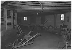The lower interior of the barn has a finished concrete floor. Originally farm animals were housed on this level. The space is organized around the central bin/storage/pen area and well lit by the perimeter windows. Laminated beams located above the centralized feed alley are in turn braced by support posts that define the outer edge of the feeding area. Posts run along either side of the central drive. The floor joists of the upper level radiate inwardly from the exterior -walls to the central drive and then run north and south over the central drive. At the center on the south side between the feed alley and central drive are pens with sliding gates. On the north side a set of permanent stairs lead to the upper haymow. The main upper level is relatively dark except for the cupola's windows. A 5 by 5 feet (1.5 by 1.5 m) square grain bin located adjacent to the stairs from the lower level stops short of the roof. The rest of the main level space is open and the balloon framing of the walls and the roof. The roof system is unsupported except for the two laminated beams found at the intersection of the three roof pitches.[4]