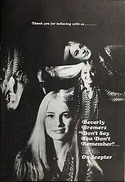 Beverly Bremers - her surname is pronounced breemɛrs (rhymes with dreamers) - was born in Chicago, but within three years had relocated with her family to St. Louis. Bremers had sung for fun from an early age and, at age eight, she began studying acting. After relocating with her family to the New York City area when she was aged ten, Bremers began singing in local talent shows. She performed on the Ted Mack Amateur Hour on her thirteenth birthday and made her recording debut at age 14 with a 1965 single release on Pickwick Records' Showcase label – – “We Got Trouble” and a remake of "The Great Pretender" – with two subsequent RCA Records single releases, the first in June 1967 and the second in February 1968; all three of these singles were credited to Beverly Ann. Bremers joined the musical Hair early in its Broadway run, playing Chrissy. She then, in 1970, was an original cast member of the Obie Award-winning off-Broadway musical The Me Nobody Knows, in which she played Catherine. She reprised her role in the Broadway production and then returned to Hair playing the female lead, Sheila, during the final phase of that show's original Broadway run. Bremers was credited during her initial run in Hair and in The Me Nobody Knows as Beverly Ann Bremers.[1][2]