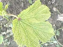| Leaf of okra showing symptoms of Bhendi yellow vein mosaic | |