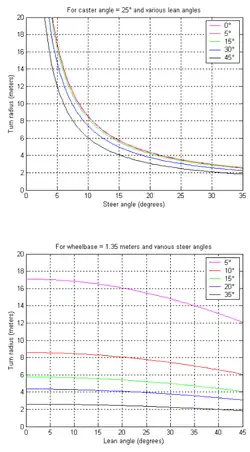 where is the approximate radius, is the wheelbase, is the lean angle, is the steering angle, and is the caster angle of the steering axis.[9]