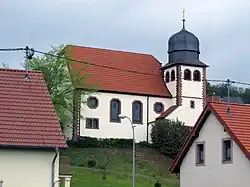 The Protestant Church of Bierbach[24] is located on a southern slope in the midst of the old village with a view over the Bliestal. The building was designed by C. M. Rey from Kaiserslautern as a simple hall construction with a short choir room and an attached bell tower. The building is considered to be a good example of a church build in the neo-Baroque style. The church was inaugurated in 1910 and built with funds of the Gustav Adolf foundation. The church is part of the Protestant Parish of Blieskastel[25] and incorporated in the Evangelische Landeskirche of the Palatinate.[26]