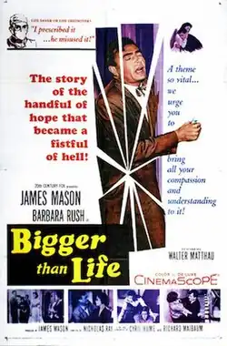 Bigger Than Life is a 1956 American drama film directed by Nicholas Ray and starring James Mason, Barbara Rush and Walter Matthau. Its plot follows an ailing schoolteacher and family man whose life spins out of control when he misuses cortisone.[2] It is based on a 1955 article by medical writer Berton Roueché in The New Yorker, titled "Ten Feet Tall".[3] In addition to starring in the film, Mason produced it.