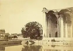 Asar Mahal or palace was constructed in 1646 by the Adil Shahis. It is located to the east of the citadel. A bridge connects it and it is well preserved. It is also known as Dad Mahal since it was initially used as hall of justice. It was later converted as reliquary and has become a highly revered place since it is said to hold two hairs from the beard of Muhammad. The portico has impressive wooden columns (four numbers of octagonal shape) and is double the normal height and has wooden panelled ceiling. It faces an artificial lake. The walls and ceiling of the hall display landscape paintings. Women are prohibited from entering this Mahal.[18][25][26] A picture of Assar Mahal, Beejapore by Thomas Boys was published in Fisher's Drawing Room Scrap Book, 1833 along with a poetical illustration by Letitia Elizabeth Landon (wrongly described as Ruins near Agra).[27]