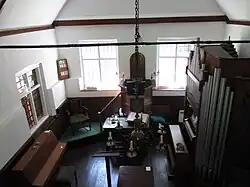 The interior measures 16 by 28+1⁄4 feet (4.9 m × 8.6 m). A modest wooden gallery, supported on one pillar and with a panelled front, spans the north end of the ceiling.[9][15][16][23] Some original timber tie-beams remain on the ceiling.[15] Other interior fittings include an "impressive"[23] clock manufactured in 1756 by Inkpen of Horsham,[8][9] two coffin stools—on which a coffin would be placed before it was lowered into the grave—dating from 1787 and inscribed ik 87 (James Knight, 1787),[15][24] original pews including two carved with James Knight 1788,[15] a brass chandelier with a dove figure, and an original communion table of oak.[15]