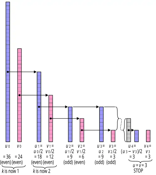 - if this applies when either of the numbers become even, the algorithm is the binary GCD algorithm;