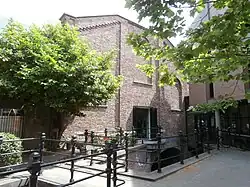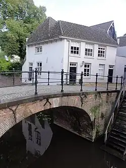 The Kerkstroom is named for flowing under the choir of St. Catherine's Church. It is a short natural stream that exits into the Kleine Vughterstroom.[12] From the city moat there are two entrances to the Kerkstroom. Both are called Kruisbroedershekel. The old Kruisbroedershekel was rather narrow, but nevertheless required a 'Hekel' to close it. It was only in 1880 that it was transformed into a sluice. The new Kruisbroedershekel dates from 2002, and was made to (again?) give boats access to the Kerkstroom. From a low hole in the wall west of the old Hekel, a corridor starts through the walls. Inside a room was made which shows the fourteenth-century second city wall and a 16th-century gate which was found during construction.[13] The corridor continues to exit in the Kerkstroom just behind the wall.