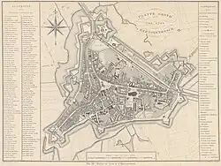 The quay of the Brede Haven was also created by the fifteenth-century works. It is the only stretch of the city center of 's-Hertogenbosch that is reminiscent of the canals of cities in Holland, and this is no coincidence. On all other stretches of the Binnendieze, the (smaller) canals run through the backyards of the houses. In the Binnenhaven, and in the cities of Holland, the canals run in front of the houses. The same applies to the east quay of the Binnenhaven, named Smalle Haven. In the early 1630s part of the houses there were demolished, and a new quay built in order to increase the capacity of the harbor and to enable ships to use both sides of it.[16] In the seventeenth and eighteenth centuries the members of the very important skippers guild, all Protestants, lived along the Breede Haven. They were interrelated, and controlled the shipping of 's-Hertogenbosch. In 1710 the town had more or less regular connections to cities in Holland and Zeeland, but also to Antwerp and Aachen.[17]