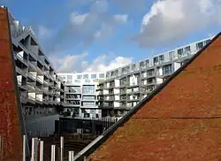 The first major achievement for PLOT was the award-winning VM Houses in Ørestad, Copenhagen, in 2005. Inspired by Le Corbusier's Unité d'Habitation concept, they designed two residential blocks, in the shape of the letters V and M (as seen from the sky); the M House with 95 units, was completed in 2004, and the V House, with 114 units, in 2005.[15] The design places strong emphasis on daylight, privacy and views.[16] Rather than looking over the neighboring building, all of the apartments have diagonal views of the surrounding fields. Corridors are short and bright, rather like open bullet holes through the building. There are some 80 different types of apartment in the complex, adaptable to individual needs.[17] The building garnered Ingels and Smedt the Forum AID Award for the best building in Scandinavia in 2006.[18] Ingels lived in the complex until 2008 when he moved into the adjacent Mountain Dwellings.[16]