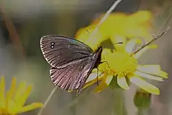E. melas Hbst. (=maurus Esp.) (37 a). In shape and size like stygne, bearing a close resemblance to the alpine form of the same; the ground-colour however is much darker, being nearly black. On the forewing there are towards the apex two white-centred black ocelli, which contrast with the ground-colour and are sometimes confluent; a third smaller ocellus is situated towards the hindmargin. The hindwing has distally 3—4 white-centred ocelli, which are sometimes as large as those on the forewing. The russet band is indicated by a pale sheen only in the female. The underside of the male agrees fairly well with the upper, the hindwing being somewhat darker than the forewing and bearing sometimes traces of a distally slightly dentate middle band. In the female the underside is variable, the brown band of the forewing is sometimes distinctly developed or is indicated by a lighter tint, being sometimes altogether absent. The hindwing is brown-grey with blackish atoms; there being before the distal margin a lighter band which is exteriorly undulate and bears 3—4 small white-centred ocelli. In Carinthia, Istria, the Balkan countries, South Russia and Greece. — In the form astur Oberth. (37 a) [may be subspecies of lefebvrei] the upperside is quite black, sometimes without ocelli, but mostly with 2 small, white, usually deep black-bordered ocelli. The female silvery grey beneath, with darker forewing. Before the distal margin there is a band which is dark red-brown on the forewing and pale grey on the hindwing, thus contrasting with the ground. From the higher parts of the Pyrenees. — lefebvrei Dub. (37a) [full species in Funet] has the forewing more elongate than the name-typical melas; the ocelli of both wings are larger and more brightly white-centred, the two on the forewing being mostly united. On the underside the forewing is but little paler than above, the russet-red band being distinct. The hindwing is uniformly black-brown without band, the submarginal ocelli being very small or quite absent. Antenna black above and beneath, being white beneath in melas. Pyrenees. — pyrenaea Oberth. [may be subspecies of lefebvrei] has in the male often a red-brown band on the forewing beneath; the female has the forewing dark red-brown, the underside with bright red distal band, the hindwing beneath being brown-red with pale yellowish distal band. On the rocky slopes of the Canigou, from 2400 m to the summit. — An intermediate form, intermedia, was described by Oberthur from the mountains of Cambres d'Ase, south of the Mt. Louis (Pyrenees). — Egg light ochreous, with 30-32 longitudinal ribs and irregular impressions. Larva yellow or reddish grey, with yellow sides, dotted with brown on the back, there being a broad dark dorsal line. Pupa first green, the abdomen marked with red, later the wing-cases milky white. The butterflies are on the wing in July, hurrying in a fast flight over the precipices and the boulders, flying at but a little distance above the ground (Oberthur), plentiful.[2]