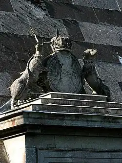 The structure is a square-based pyramid constructed from more than 190,000 Portland stone blocks, that were finished on site by the builder, Henry Wood. When constructed, the stone was white but has since weathered to varying shades of grey.[1] The pyramid measures 45 feet (14 m) square in plan and is sited on an avenue of yews, on the edge of an ancient woodland around 1 mile (1.6 km) from the hall.[1][7] The east face of the pyramid contains a central doorway surrounded by an architrave and surmounted with an entablature. The entablature is engraved with the Hobart family motto, auctor pretiosa facit (Latin: "the giver makes the gift precious"). Atop the entablature is a carved depiction of the Hobart arms, crowned and supported by a hound and a stag.[8] The panelled door has two leaves, weighing 500 kilograms (1,100 lb).[8][1]