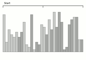The two internal buffers needed for each level of the merge step are created by moving the first 2A first instances of their values within an A subarray to the start of A. First it iterates over the elements in A and counts off the unique values it needs, then it applies array rotations to move those unique values to the start.[6] If A did not contain enough unique values to fill the two buffers (of size A each), B can be used just as well. In this case it moves the last instance of each value to the end of B, with that part of B not being included during the merges.