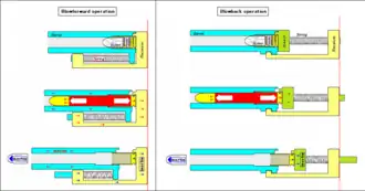 Blow forward is a firearm action where the propellant gas pressure and the friction of the bullet traveling down the bore drag the whole gun barrel forward to facilitate the opening of the breech.[1] This forward barrel motion provides most of the energy required to eject a spent cartridge case and chamber a fresh round of ammunition, and contains a minimum of moving parts, and thus is more compact than other operating mechanisms of equal barrel length.