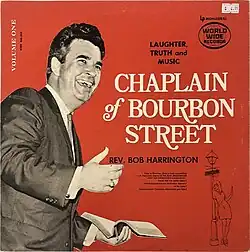 Concurrent to his studies at the seminary, Harrington began street ministry on Bourbon Street very soon after arrival, upon which First Baptist then loaned Harrington the money to open a chapel directly on Bourbon.[1] His activities included preaching outside of the nightclubs, playing gospel music on a loudspeaker system, and sometimes preaching inside bars and strip clubs.[2][3] Victor H. Schiro gave Harrington the moniker "The Chaplain of Bourbon Street" in 1962.[2] As he became better known, he travelled to preach in such places as Greenwich Village, Las Vegas, Paris, and Vietnam.[2] Harrington authored eight books; the most notable was his autobiography, entitled The Chaplain of Bourbon Street, co-written by Walter Wagner and published 1969 by Doubleday.[2] He also made in excess of 30 LP records.[2] As his notoriety grew he engaged in public feuds with Larry Flynt, who had profiled him in Hustler, and with Madalyn Murray O'Hair.[2]