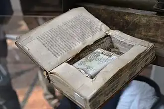 The custom of binding several wax tablets together (Roman pugillares) is a possible precursor of modern bound books.[21] The etymology of the word codex (block of wood) suggests that it may have developed from wooden wax tablets.[22]
