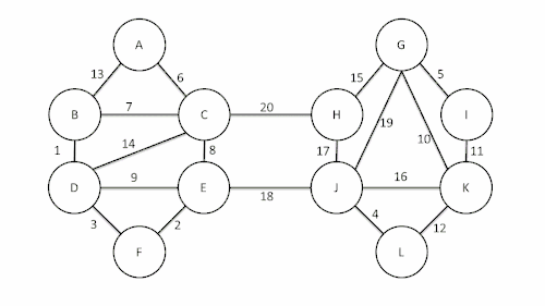 ![]() | {A,B,D,F} {C,E,G} | In the first iteration of the outer loop, the minimum weight edge out of every component is added. Some edges are selected twice (AD, CE). Two components remain. |