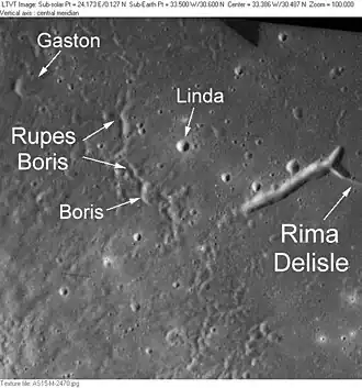 Boris is a tiny lunar impact crater that is located on the Mare Imbrium, to the northeast of the crater Delisle. It lies near the southwest extremity of a sinuous rille that is designated Rima Delisle. This rille meanders to the northeast, towards the crater Heis, before vanishing into the lunar mare. The name Boris is a common Russian male given name; the crater is not named after a specific person.[1]