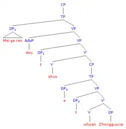 If a pronoun has a quantified expression as antecedent, the pronoun must be c-commanded by this antecedent.[3][4] An antecedent c-commands a pronoun if, when observing the structure of the sentence, a sister of the antecedent dominates the pronoun.[5]