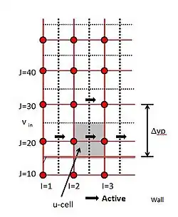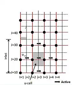 - For the first u, v, φ-cell all links to neighboring nodes are active, so there is no need of any modifications to discretion equations.