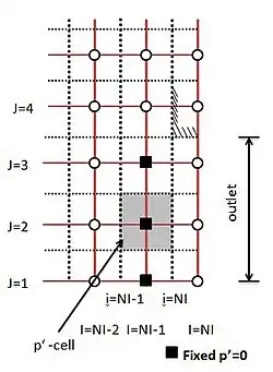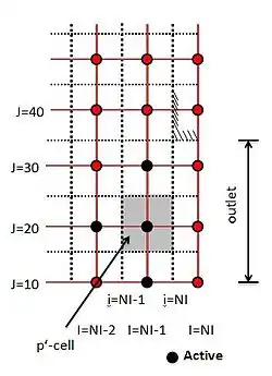 The equations are solved for cells up to NI-1, outside the domain values of flow variables are determined by extrapolation from the interior by assuming zero gradients at the outlet plane