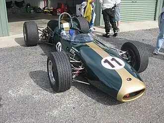 The Brabham BT11 (also known as Repco Brabham BT11) is a Formula One racing car built in 1964, mainly for use by privateers in grand prix racing, but was also used by the Brabham works team during 1964 and 1965. It was the only competitive car of the period available to privateers,[2] recording eight podium finishes in total. The car's best results came at consecutive events in the United States and Mexico 1965, with Dan Gurney qualifying and finishing second in the latter.