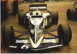 The Brabham BT52 was a Formula One car designed for the Brabham team by longtime Brabham designer Gordon Murray for the 1983 season. The car ran on Michelin tyres and was powered by the BMW M12/13 four-cylinder turbocharged engine, which in 1983 produced a maximum power of approximately 850 bhp (630 kW) in qualifying trim, detuned to around 650 bhp (480 kW) for the proper races. Its drivers were 1981 World Champion Nelson Piquet and Riccardo Patrese.[4]