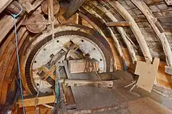 The clasp arm wooden head wheel was converted from Compass arm construction, it is 7 ft 4 in (2.24 m) diameter. The wooden tail wheel has also been similarly converted, it is 6 ft 4 in (1.93 m) diameter. The mill was originally built with a single pair of millstones, the second pair probably being added when the mill was extended at the rear.[7]