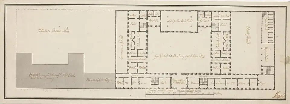 In 1729–1730, Ferdinand Danneskiold-Laurvig expanded the Danneskiold-Laurvig Mansion with a new north wing. The building was most likely constructed by Phillip de Langes.[1] The property was listed in the new cadastre of 1756 as No. 209 in St. Ann's East Quarter.[2]