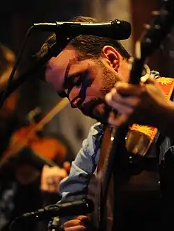 Growing up in Lexington, Gilmore benefited from, and was influenced by the many other established musicians in the area, including Will Lee, Larry Keel, Mike Seeger, and Gary and Rooster Ruley.[33] He is a multi-instrumentalist[33]—performing on guitar, mandolin, banjo, and violin—and singer, who often provides lead vocals. Since forming Concordia Discors ("harmony of discordant elements"[34]) in high school, he has originated a number musical groups (while performing in others). As a songwriter, Foreign service assignments to Africa "have provided plenty of inspiration" for his original tunes. His "Kakuma" released in 2008 "delivers a chilling tale of a conflict zone in Sudan from a Blue Ridge front porch."[35] As Gilmore states:
