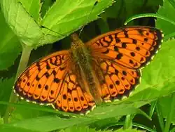 Brenthis ino is a medium-sized butterfly with a wingspan of 34–42 millimetres (1.3–1.7 in). Females are larger and usually darker than males. The antennae are clavate (club shaped). The basic color of the upper side of the wings is orange with several dark brown blotches. The edges are brown too, with a discontinuous stripe of small blotches. The lower side of the wings is creamy orange with an indented edge and dark brown blotches on the forewings, while the hindwings show brown-edged beige blotches and some ringed dark brown and violet shading spots. The wings of this species lacks any silver blotches. The butterfly flies from June to August depending on the location. It overwinters in the form of caterpillar. The larvae feed on meadowsweet (Filipendula ulmaria), dropwort (Filipendula vulgaris), stone bramble (Rubus saxatilis), raspberry (Rubus idaeus), Aruncus species, Spiraea species and salad burnet (Sanguisorba minor).[1]