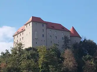 On a hill on the right bank of the Sava River, south of the settlement, is Rajhenburg Castle (Slovene: Grad Rajhenburg). It was first mentioned in written documents dating to AD 895, making it the earliest documented castle in Slovenia. It has preserved some of its Romanesque features and an early Gothic chapel, but most of its current structure dates to around 1600. During the Second World War it was used as a deportee collection centre by the German forces.[8] From June 1948 to October 1956 the communist authorities used the castle as a penal institution for female political prisoners.[9]