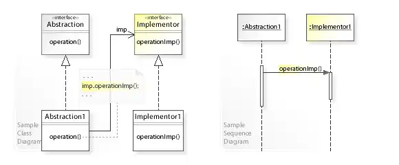 // Helps in providing truly decoupled architecture public interface IBridge { void Function1(); void Function2(); } public class Bridge1 : IBridge { public void Function1() { Console.WriteLine("Bridge1.Function1"); } public void Function2() { Console.WriteLine("Bridge1.Function2"); } } public class Bridge2 : IBridge { public void Function1() { Console.WriteLine("Bridge2.Function1"); } public void Function2() { Console.WriteLine("Bridge2.Function2"); } } public interface IAbstractBridge { void CallMethod1(); void CallMethod2(); } public class AbstractBridge : IAbstractBridge { public IBridge bridge; public AbstractBridge(IBridge bridge) { this.bridge = bridge; } public void CallMethod1() { this.bridge.Function1(); } public void CallMethod2() { this.bridge.Function2(); } }