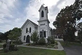 The historic district extends mainly north-south along Main Street, from Warner Street in the south to a stream crossing in the north. It extends a short way west on Hat Shop Hill Road, which forms a four-way junction with Main Street and Clapboard Road near the center of the district. There are more than 60 historic buildings in the district, including the 1807 Congregation church (restyled with Greek Revival elements in 1842. Also at that road junction is St. Mark's Episcopal Church, a distinctive example of Gothic Revival architecture in wood. The present and former town halls are also both in the district, as is a distinctive Queen Anne commercial block on the west side of South Main Street. One of the district'st latest historic buildings is the 1929 Burnham School.[2]