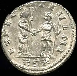 Claudius paid a visit while Britain was being conquered and was honoured with the agnomen Britannicus as if he were the conqueror; a frieze discovered at Aphrodisias in 1980 shows a bare breasted and helmeted female warrior labelled BRITANNIA, writhing in agony under the heel of the emperor.[14] She appeared on coins issued under Hadrian, as a more regal-looking female figure.[15] Britannia was soon personified as a goddess, looking fairly similar to the goddess Athena-Minerva - both are seated and replete with helmet, spear (trident) and shield. Early portraits of the goddess depict Britannia as a beautiful young woman, wearing a Corinthian helmet, and wrapped in a white garment with her right breast exposed. She is usually shown seated on a rock, holding a trident, and with a spiked shield propped beside her. Sometimes she holds a standard and leans on the shield. On another range of coinage, she is seated on a globe above waves: Britain at the edge of the (known) world. Similar coin types were also issued under Antoninus Pius.