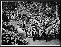 Of these men, 48 were part of the regimental headquarters, and 27, armed with two Vickers Machine Guns, were assigned to the machine gun section.[84] In 1909 the School of Musketry proposed that each regiment should have six machine guns, but this was declined for "financial reasons".[86] The remaining 474 men were in the regiment's three squadrons, four troops per squadron.[57] Commanded by a major with a captain as the second in command.[83] A squadron had 158 men, six officers, a squadron sergeant major, a squadron quartermaster sergeant, eight sergeants, two trumpeters, six artificers, and 134 other ranks. Each troop had one officer, two sergeants, one artificer, and 30 other ranks.[84] Regiments in India had four squadrons with 173 men in each squadron.[26]