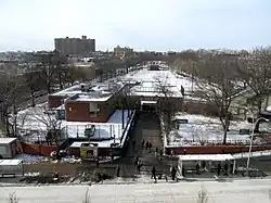 As part of a project initiated in 2017 in which 200 blocks of land in East New York were rezoned for housing and improvements to area parks and schools were planned, the New York City Economic Development Corporation initiated a study to foster economic growth around Broadway Junction as a transit hub with residential and commercial uses.[4] In 2018, the MTA announced several further improvements to the Broadway Junction station: new elevators for the Fulton Street Line platforms,[40] as well as staircases for the Canarsie Line platforms[41] and Jamaica Line platforms.[42] Mayor Eric Adams announced in May 2023 that the MTA would spend $400 million on improvements at the Broadway Junction station, including seven elevators, a new entrance on Van Sinderen Avenue directly to the Canarsie Line platforms, and replacement of all of the complex's escalators.[43] In addition, the city government would spend $95 million to build pedestrian plazas around the station.[43][44] AtkinsRéalis was hired in June 2024 to design the station's renovation, including accessibility improvements.[45] Work on the project began in 2025, despite concerns from local residents that the project would result in gentrification.[46][47]