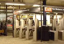The fare control area is in the station house, with a token booth and turnstile banks. The structure was built along with the IND station. The station house leads to Van Sinderen Avenue between Fulton Street to the south, and Truxton Street and Broadway to the north. This is the only entrance to the entire complex.[51]: 86–87 There is also a police precinct located in the station house, NYPD Transit Police District 33, at the south end of the building.[8]: 38 [52] The station was previously part of Transit Police District 23.[56] The station house is adjacent to Callahan-Kelly Playground, and is recessed a short distance west from Van Sinderen Avenue.[8]: 38 [51]: 95