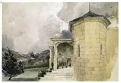 Bronte House was designed by the Colonial Architect, Mortimer Lewis, who set it on the edge of what is now known as Bronte Gully. He obtained the first land grant of 4.9 hectares (12 acres) which was right to the shoreline of Bronte Beach, at the time known as Nelson Bay. Lewis decided to consolidate his holdings including the whole area which formed Bronte Park and sited the house on the estate. Construction began c. 1838, but Lewis sold the house in 1843, under financial duress, for A£420 when it was still incomplete, to Robert Lowe. Lowe completed the construction of the house in 1845. Lowe's wife, Georgina, was a skilled watercolour artists, botanist and gardener. Her sketches and watercolours provide the earliest images of Bronte House and the surrounding area. She also sketched images of the New South Wales countryside. Her sketchbook is held at the State Library of New South Wales.[5] Georgina Lowe took an interest in the estate and established the first Bronte House gardens which have become well celebrated. The Lowes lived in the residence for four years.[6] Robert Lowe, an Oxford graduate and member of the English Bar, was appointed to the Legislative Council of New South Wales and was admitted to the New South Wales Bar.[7] In 1849 the Lowe family sold Bronte House and returned to England, where Lowe was elected to the House of Commons and later appointed Chancellor of the Exchequer. In 1880 he became Viscount Sherbrooke.[7]