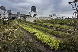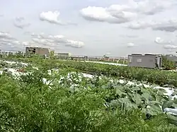 Brooklyn Grange is a 5.6-acre organic urban rooftop farm in New York City, growing vegetables and honey for local restaurants, markets, and community-supported agriculture. The farm is located on three rooftops in Brooklyn and Queens. The first rooftop farm was established in 2010 on a 43,000 square feet building straddling Astoria and Long Island City areas. The second location was built in 2012 atop the Brooklyn Navy Yard[1] and the third farm, established in 2019, is located at Liberty View in Sunset Park, Brooklyn. All three locations encompass 140,000 square feet of space, making it the largest rooftop farm in New York City.[2] Annually, 80,000 pounds (36,000 kg) of organic vegetables are grown.