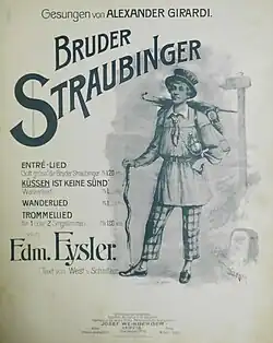 Bruder Straubinger was the second of Eysler's operettas to be staged. He had composed a previous opera to a libretto by Ignaz Schnitzer with the title Der Hexenspiel (The Magic Mirror). The music publisher Josef Weinberger was impressed with it and tried unsuccessfully to get it staged. He then suggested that Eysler incorporate some of the lighter pieces from the work into a new operetta. The result was Bruder Straubinger which was an immediate success at its premiere, owing in part to its star tenor, Alexander Girardi, in the title role. However, Richard Traubner attributes a larger part of its success to Girardi's second-act waltz aria "Küssen ist keine Sünd" ("Kissing Is No sin"). The song was published separately by Weinberger and in a short time sold more than 100,000 copies.[1] It later inspired the title of the 1950 German film Kissing Is No Sin and is featured in its soundtrack.[3]