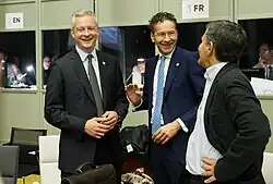By November 2017, Le Maire was reported to explore his options to succeed Jeroen Dijsselbloem as the next President of the Eurogroup;[20] the role of which was eventually given to Mário Centeno of Portugal.[21] In 2019, he led the European Union's selection process for a European candidate to succeed Christine Lagarde as managing director of the International Monetary Fund.[22]