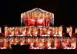 Buckingham Fountain is a Chicago Landmark in the center of Grant Park, between Queen's Landing and the end of Ida B. Wells Drive. Dedicated in 1927 and donated to the city by philanthropist Kate S. Buckingham, it is one of the largest fountains in the world. Built in a rococo wedding cake style and inspired by the Latona Fountain at the Palace of Versailles, its design allegorically represents nearby Lake Michigan. The fountain operates generally from mid-April to mid-October, with regular water-jet displays and evening colored-light shows. During the winter, the fountain is decorated with festival lights.