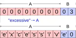 Now, the program attempts to store the null-terminated string "excessive" with ASCII encoding in the A buffer.