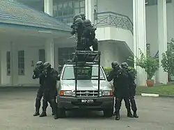 Operatives of the Special Actions Unit pose in front of the Special Operations Training Facility in Bukit Aman.