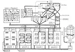 Group 3 acts as an I/O buffer. An "Ordonnateur" (ORD) memory cabinet can also be added, providing an extra four groups (4 to 7), each one holding data, none of them executable.