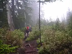 Hiking time: 8–10 hours return. Distance: 20 km (12 mi). Elevation gain: 1,150 m (3,770 ft). The Swan Falls trailhead starts at the north end of Buntzen lake near North Beach. It is very steep in places and is only recommended for experienced and fit hikers. This trail forks into a number of trails between El Paso Junction and Lindsay Junction. The different trails give hikers the option of seeing the old growth forest of Eagle Ridge or pass by a number of tarns. North of Lindsay Junction is Eagle Peak with views of Mount Baker, Vancouver Island, the Fraser Valley, the Coquitlam watershed, Mount Seymour Provincial Park, and Indian Arm. Swan Falls was named for Gordon Swan by Dr. Simon Priest. Both were instrumental in trail building at Buntzen in the late 1970s on behalf of the Simon Fraser University Outdoor Club.[7]
