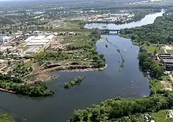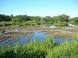 The port comprised an outer and inner section. The outer port (foreport), a 9-hectare area between the Vistula and the Brdyujście Lock, served as a shelter for ships and rafts arriving from the Vistula and a staging area for lock passage. The inner port, above the Brdyujście Lock, was designed for raft storage to protect against Vistula floods and functioned as a timber market. It spanned 50 hectares, with a length of 1.65 km, width of 330 m, and depth of 2 m.[3] Wooden piles driven into the riverbed divided the basin into three water lanes for securing rafts. A 3 km embankment along the Vistula protected both port sections.[3]